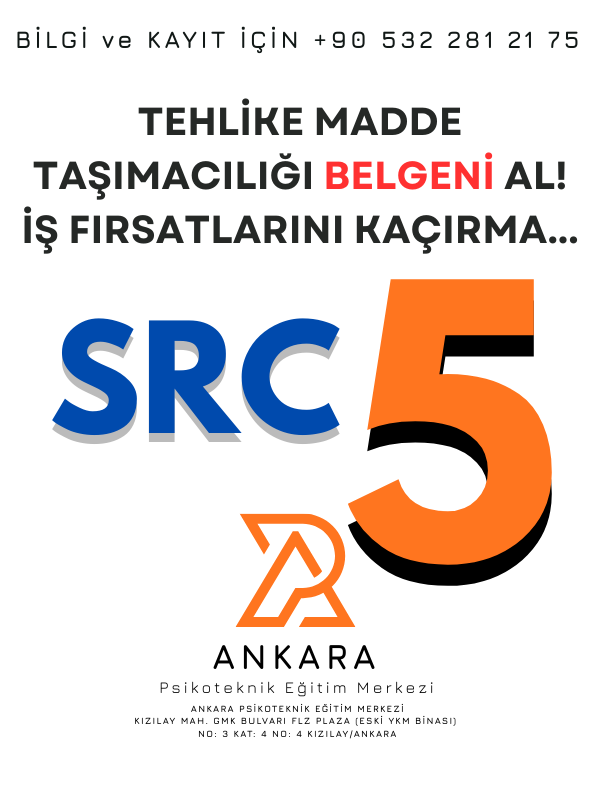 Src 5 Belgesi: Tehlikeli madde taşıyan aracı kullanan şoförlerin aldığı bir mesleki yeterlilik belgesidir. Mesleki ve branşta uzmanlık yeri geldiği zaman risklerin ortadan kalkması için çok önemlidir. Tehlikeli madde taşımacılığında bu tür uzmanlık belgesi olup bu çeşit taşımacılık yapan sürücülerin SRC 5 belgesine sahip olması zorunludur.